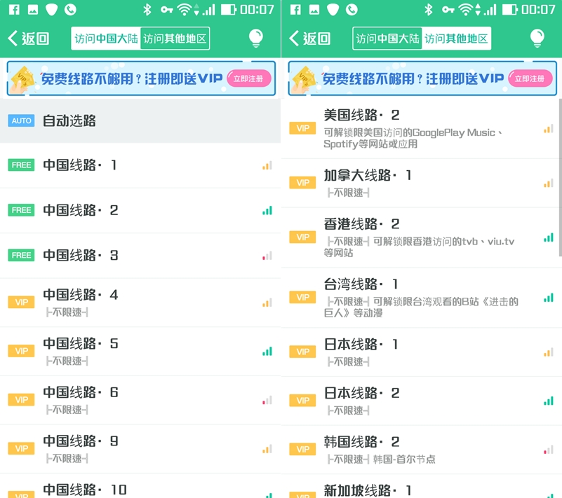 再看一下線路選擇,只要還是中國的居多,訊號也會顯示出來,其他國家就要 購買 VIP 了。