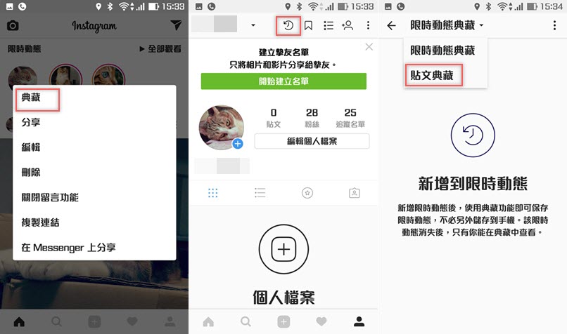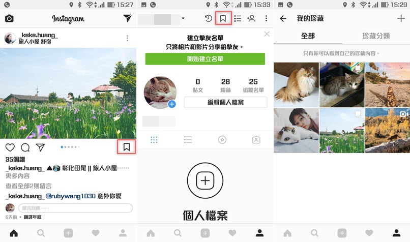 珍藏應該是大家最熟悉也最常見的功能,就在貼文右下角那個書籤圖示就是了,按下去立刻儲存,再從個人檔案上方同樣的按鈕進入,這裡就是你珍藏的全部內容。