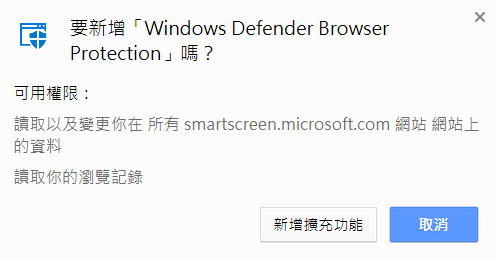 首頁 › 電腦軟體 › Windows Defender Browser Protection - 微軟出的瀏覽器外掛,防止網路釣魚及惡意網站 Windows Defender Browser Protection - 微軟出的瀏覽器外掛,防止網路釣魚及惡意網站 發佈日期:2018/4/28 作者:阿湯 分類:電腦軟體 防毒相關的軟體市面上多到數不清,現在 Windows Defender 也推出了專屬的瀏覽器套件「Windows Defender Browser Protection」,可以搭配 Chrome 內建的 Software removal tool 共同保護你的電腦,防止網路釣魚及進入惡意網站,如果你即將進入的網站在資料庫裡的黑名單列表,這些智慧篩選工具就會發出警告,你再考慮要不要進入吧。 Windows Defender Browser Protection 使用介紹: 這個擴充套件的優點是有持續在更新已報告的有害網站列表,這對防護工具來講十分重要,可以時時保持不被危險網站入侵,點加到 CHROME。 要成功運行當然會讀取你的瀏覽紀錄了,按新增。 這個小圖示就會在你的瀏覽器右上角實時防護,不想用的話可以點開來關閉,阿湯臨時找不到惡意網站去測試,大家用用看,有被擋住再跟阿湯分享吧。 Windows Defender Browser Protection 相關資訊: 擴充套件下載:請點我