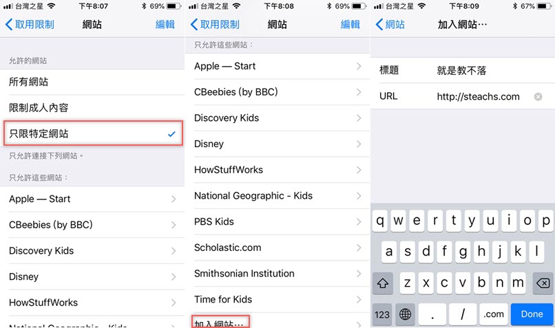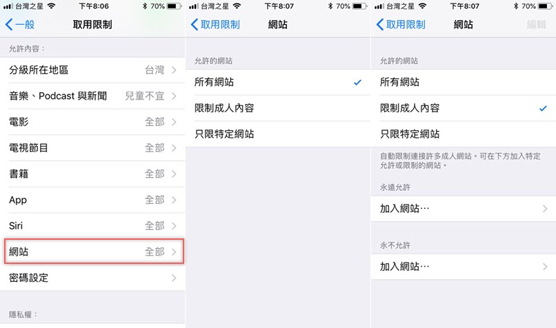 然後就可以一個個進入設定了,提供的項目蠻多的又很清楚,這邊主要來看「網站」,有三個選項,預設所有網站就是不設限,如果改限制成人內容,除了有 iPhone 認定的成人網站外還能在下面加設黑白名單。