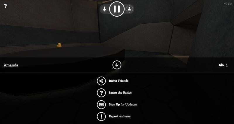 這個 Mozilla 推出的實驗性質 VR 討論室 - 「Hubs」目前測試發現並不像大家想的那樣能夠和陌生朋友們聊天交談,也無法主動進入別人的聊天室一探究竟。現在只能讓我們自行建立聊天室名稱、顯示造型、顯示 ID 後進入自己的聊天室,並且主動邀請好友、被動等待他們的加入。在聊天室中則是透過滑鼠來上下左右觀察、用鍵盤上下左右的行走進行動作,也能抓取桌上的小鴨。