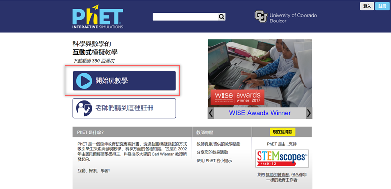 雖然看到的是全繁中頁面,但這其實是來自世界各地的內容,由社群團隊辛苦翻譯的成果,除了學生可線上使用,還提供老師們的註冊區,阿湯先不註冊,直接點「開始玩教學」。