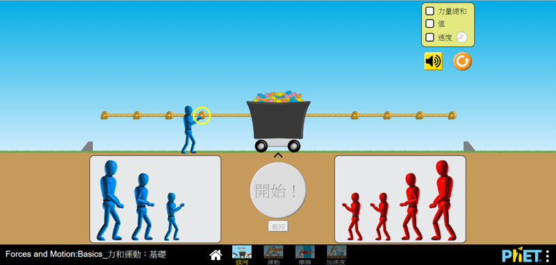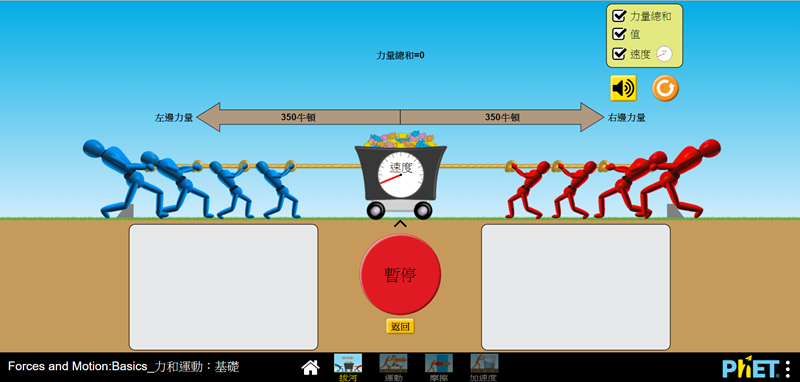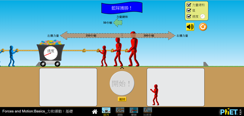 可任意移動模型,阿湯把紅隊最小的一個人拉下來再點開始,繩子就會一直往左移動,藍隊自然就獲勝了,藉由不同的組合來闡釋力和運動,好理解多了。