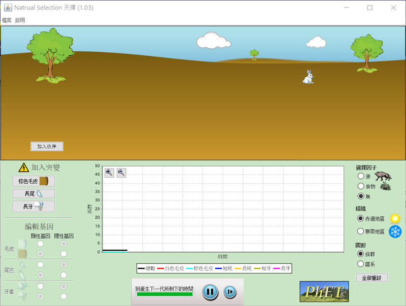 主題是天擇,給你兔子跟草原,可以編輯基因加入突變,或加入環境因子等來觀看演變。