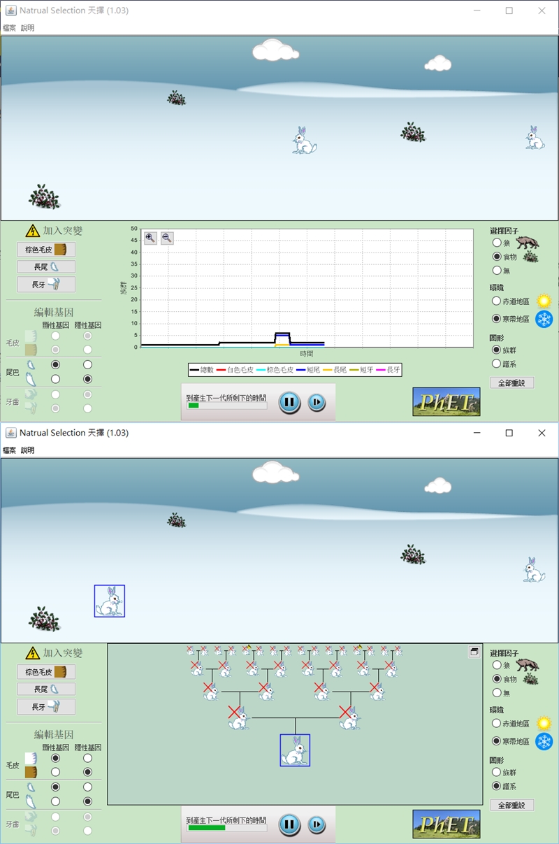 改變幾樣不同的因素後,底下會顯示到下一代出現的時間,中間的圖形可切換成譜系,阿湯就隨便點隨便玩,看最後會生出怎樣的兔子,記得放食物進去,如果放狼進去兔子就會被吃光,這邊講的是天擇嘛,澳洲的兔子也是因為沒有天敵才一直生造成災害,一起來做實驗吧。