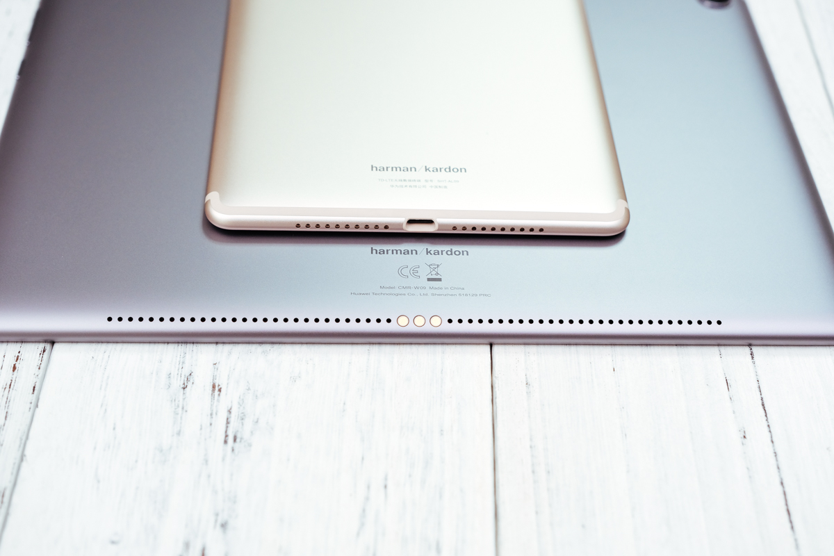 在背面的設計上可以看出更大的不同,特別是 10.8 吋 Wi-Fi 版,是採用四組由 harman kardon 所合作調校的揚聲器,阿湯自己實際聽了聲效,四組真的不是蓋的,聲音夠大,音質也很棒。而 8.4 吋 LTE 版本雖然是採用雙揚聲器,但也不用太擔心,因為同樣是由 harman kardon 這家知名音響大廠所合作調校的,在聲效的部份仍然擁有相同棒的水準。