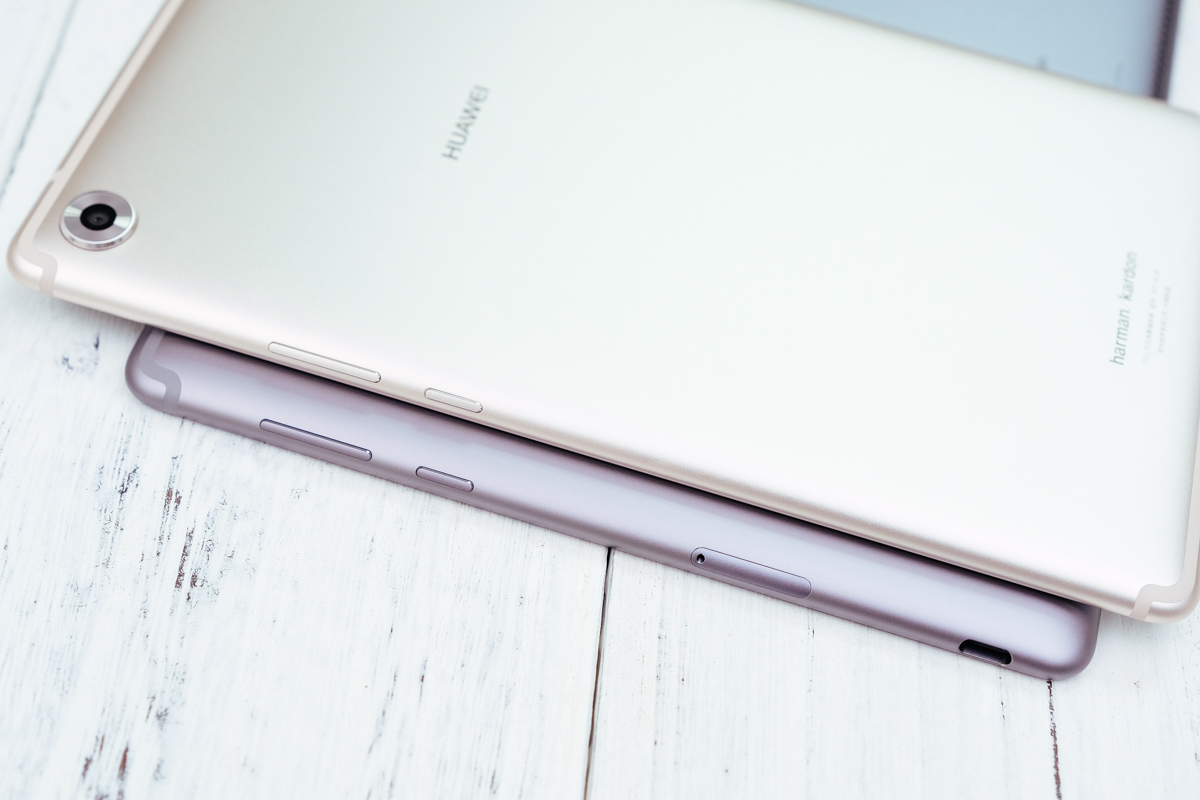 順便秀一下阿湯自己現在正在服役中的 MediaPad M3(圖左),真的蠻好用的,同樣是 8.4 吋,不過可以看的出來外觀在 M5 的設計上又再略微的縮小一些,且在邊欄的設計上更加的圓潤好握,基本上 M3 升級到 M5 還是相當有感的,讓我一直左手打右手不知道要不要換啊...