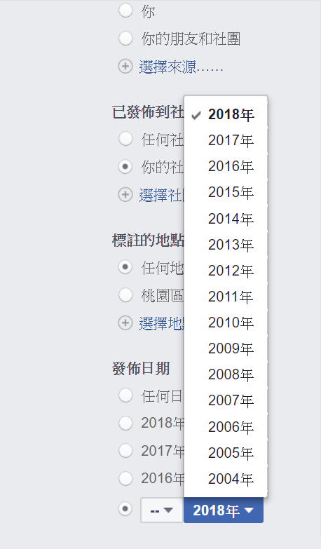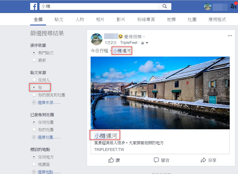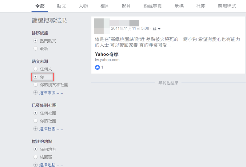 貼文來源也能輸入朋友的帳號名稱,因為「桃園高鐵站」是地名,如果對方有用這個名稱打卡也會顯示出來,換句話說,如果你想搜尋某人某年某月某日、去過某個地方,只要他有打卡,多久你都找得到,哦對了,前提是內容也要是你的權限能看到的。