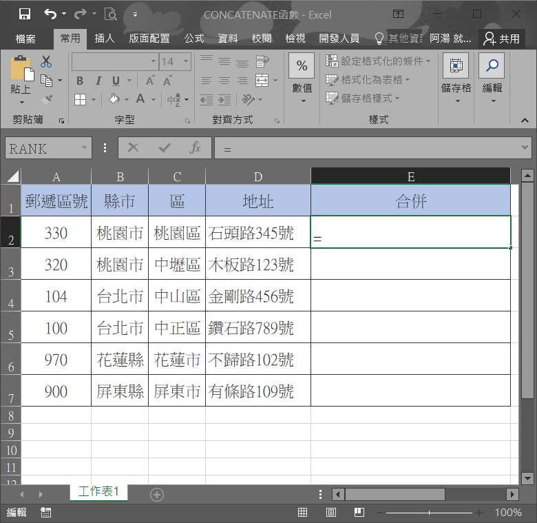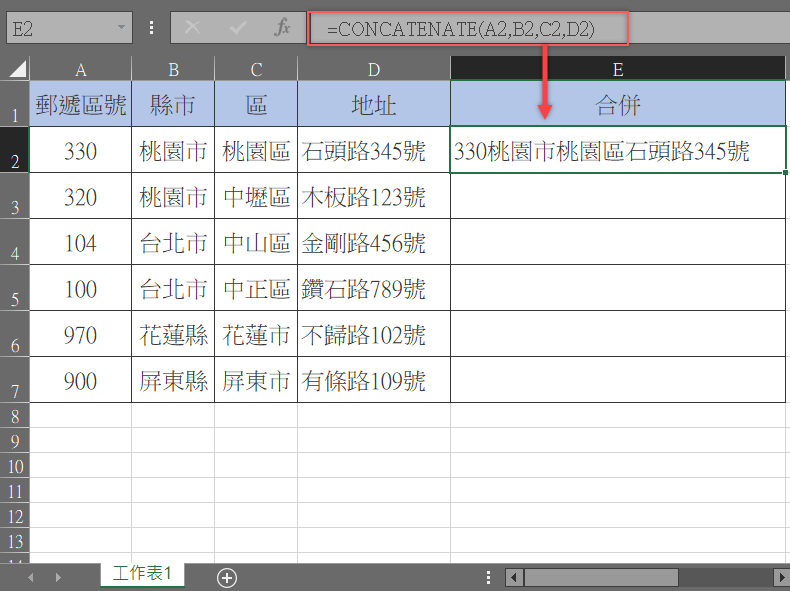 來看範例,假設我們要將前面四格全部合併成一行地址,方便記錄及列印,那要怎麼做呢?先在第五格 E2 的地方插入函數。