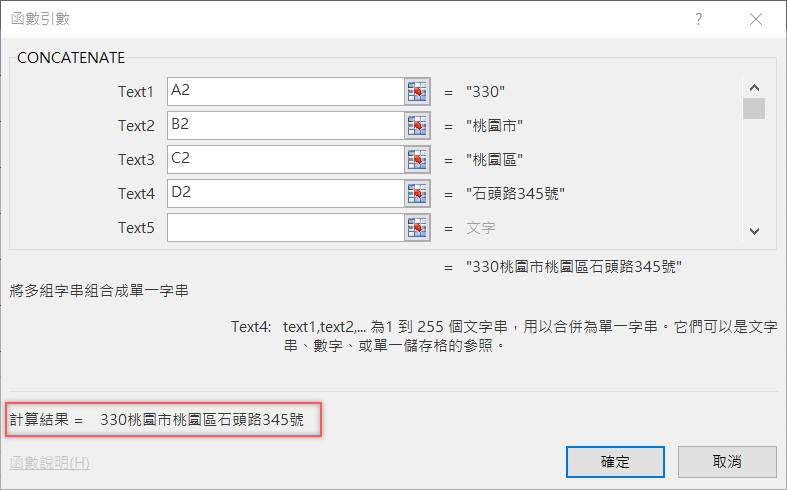 選擇 CONCATENATE 函數後,依次輸入 A2、B2、C2、D2,公式為 CONCATENATE(A2,B2,C2,D2) 計算結果會全部整合成 E2,OK 後按下確定。