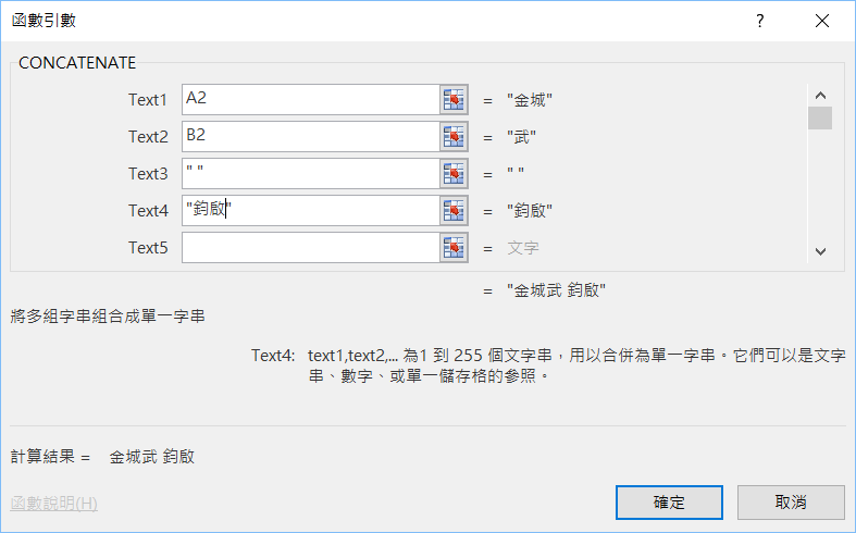 函數語法:CONCATENATE(text1, [text2], ...)