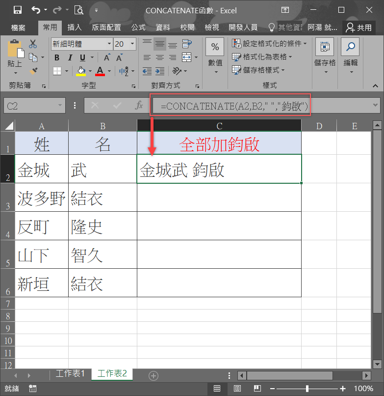 公式為 CONCATENATE(A2,B2,” ”,”鈞啟”) ,完成囉。