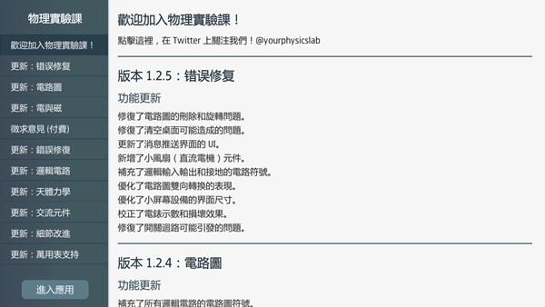 話說阿湯真的離開學校太久了,以前學過什麼都不知道,像 PhET 網站雖然有年級分類,但其實是屬於科普教育,今天這款 APP 也是標榜小學到高中、大學都適合的 APP,並支援 iOS 和 Android,首頁是更新歷程,點左下角進入應用。
