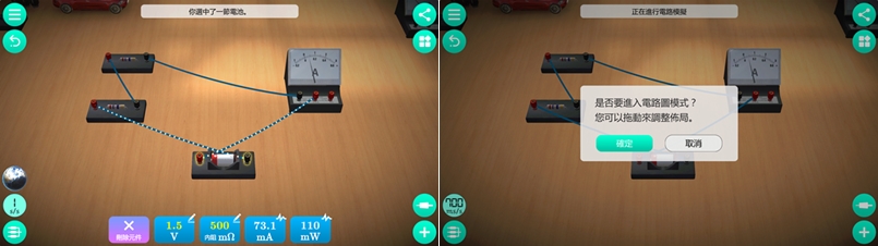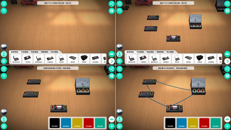 依照要進行的電路種類將底下提供的元件拖進去,像是直流安倍表、定值電阻、電池等,再點接頭連線即可,顏色可調整,因為對電路實驗沒什麼概念(忘了…),所以阿湯是照著 APP 介紹提供的圖片來擺設。