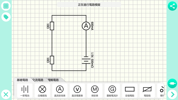 跟實境模式提供的模型相同,換成簡單的電路圖模式可能會看得更清楚,也是可選擇基礎電路、交流電路、邏輯電路元件來置入,自由調整成想要進行的實驗方式,對學生而言應該更容易理解。