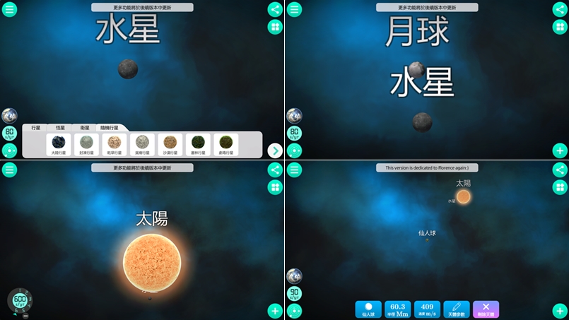 天體物理學實驗就是將行星、恆星、衛星、隨機行星,一樣拖進虛擬宇宙,會自動移動,如果覺得轉動太快可在左下角調整速度,也能用手指放大縮小觀察,阿湯就一一加入了水星、月球、太陽、仙人球等,然後讓它們自己去跑,蠻好玩的,試試看。