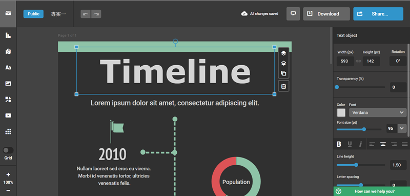 挑個黑暗模式的時間軸來編輯,如果用過類似的線上工具就會很熟悉,點選物件右欄就會顯示可以調整的內容,以文字來說就是大小、字體、行高、間距、顏色及透明度等細節。