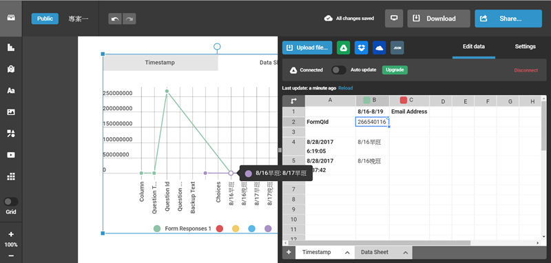 阿湯將 Google 硬碟的資料匯進去後就自動生成圖表,蠻方便的,細節也能點開來自己調整。