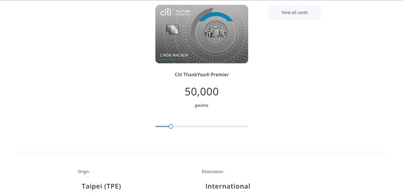 選擇卡片後調整點數,再選出發地,以花旗 ThankYou®Premier、5 萬點為例。