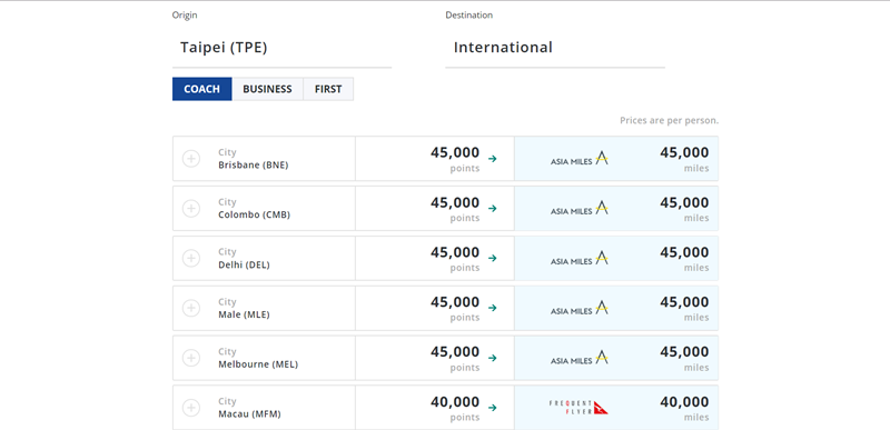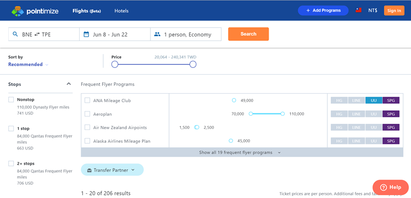 點進項目可以連到 Pointimize.com 這個網站,查看詳細的日期等航班資訊,也可以經由網站進入訂票程序,蠻方便的,大家可以拿去參考並先訂個旅行目標,點數一到就來兌換。