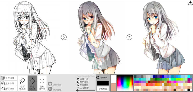 FireAlpaca,如果是要專門針對「上色」這件事情來練習,可以利用「PaintStransfer」這個網站,提供了不少漫畫範例可從簡單的線稿開始,利用滑鼠拖拉設定顏色範圍,AI 就會幫你自動辨識完成,還蠻有趣的,來畫畫看。