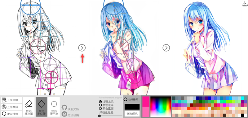 確定好顏色後,點紅色箭頭那裡就會開始轉換,大概花了幾秒鐘讀取,完成後就是最右邊那張圖,AI 會自己去判定顏色的位置與細節,所以你其實可以不必太要求,但要注意顏色不要相差太多,渲染起來會很奇怪。