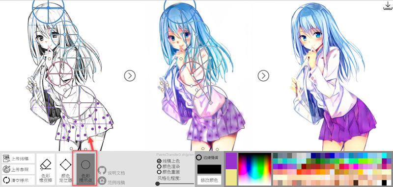 如果有地方想要比較飽滿的顏色,例如阿湯想要將裙子變成紫色,就要利用「色彩提示點」,選好顏色後,點在要加強的地方,再按轉換,最後就完成紫色裙子了,換句話說「顏色定位器」代表大範圍的顏色,「色彩提示點」代表小範圍的重點色。