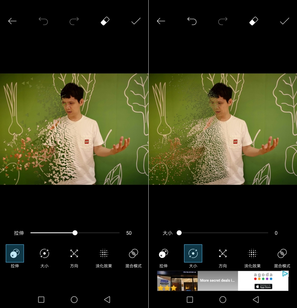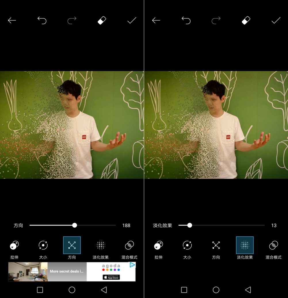 5. 接著就可以從下方提供的工具列,包括有「變形」來選擇分散的不同型態、「尺寸」來調整分散效果的大小、「方向」變化分散的碎裂方向、「褪色」改變分散效果的輕重程度以及「混合」搭配不同的特效,五種來組合呈現出自己想要的分散照片。