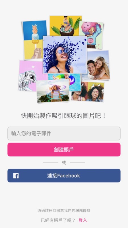 《PicsArt》提供了自行用 email 註冊或是直接用 Facebook 帳號登入兩種,如果很保護自己 Facebook 帳戶隱私的朋友建議選 email 註冊就好。