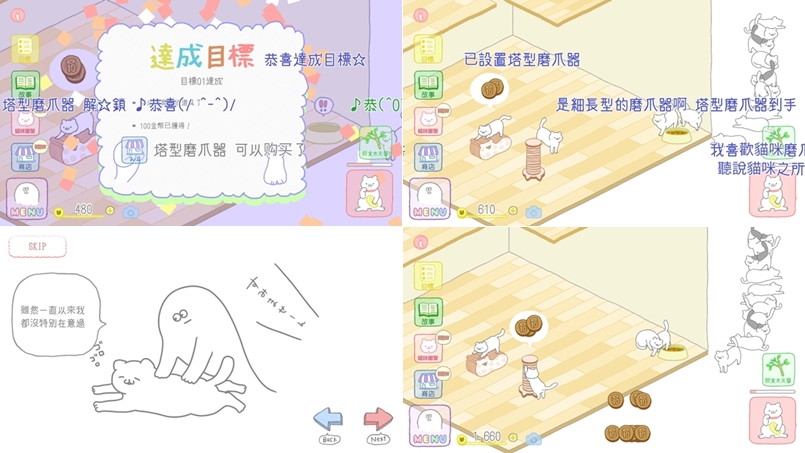 隨著目標達成可以去商店購買道具,阿湯就陸續買了兩個磨爪器,每次有新動作還會有網路鄉民式的留言加表情符號飄出,升級後會出現情節,平常就看貓咪在家裡跑來跑去。