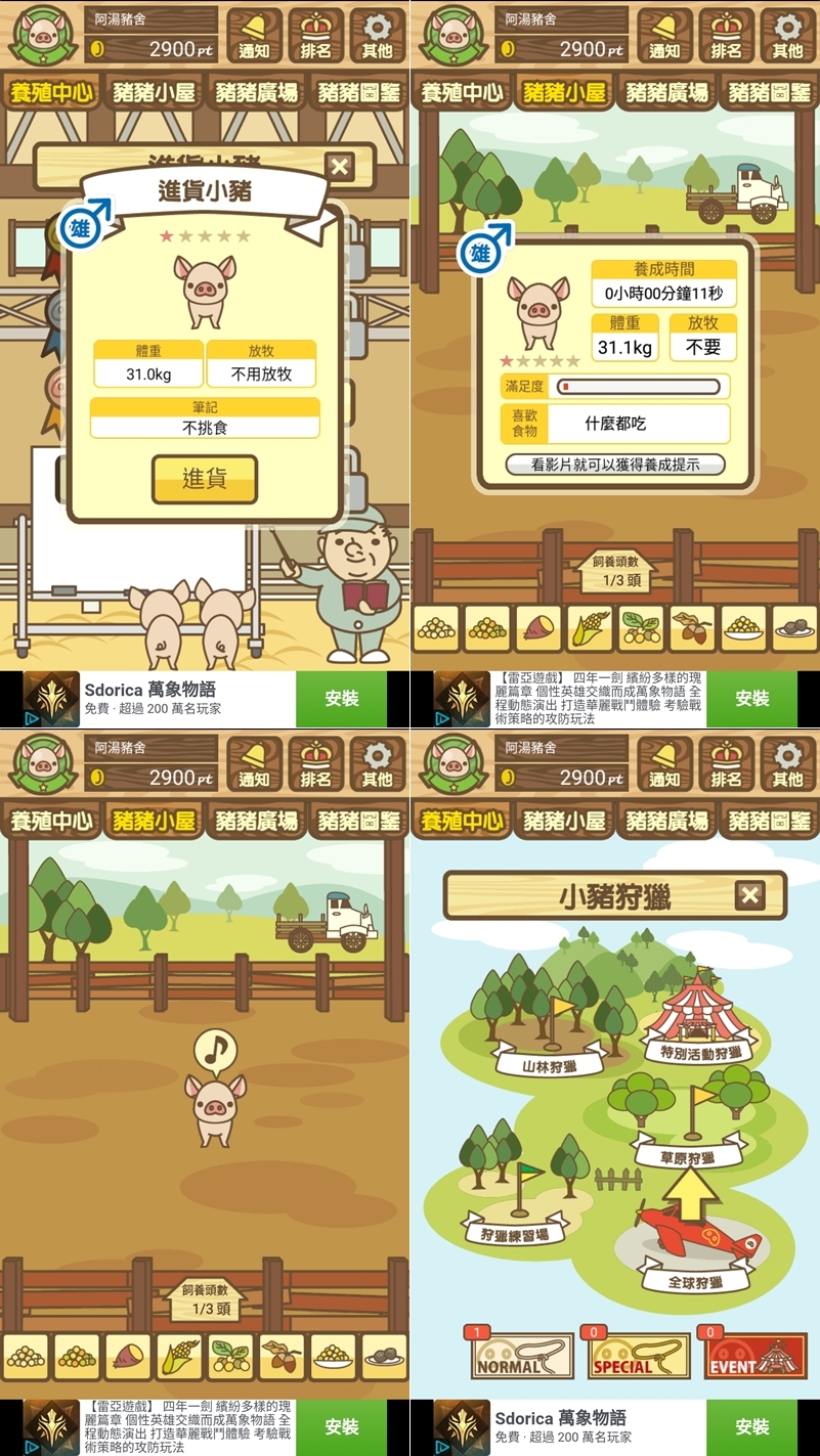 舊版養豬場可能有人玩過,不過出了新版舊款就沒在升級了,共 168 個品種屬性也不同,進貨後可查看體重及放牧等細節,看廣告可獲得養成提示,平常就丟食物進去餵食,到處狩獵豬隻或配種收集圖鑑。