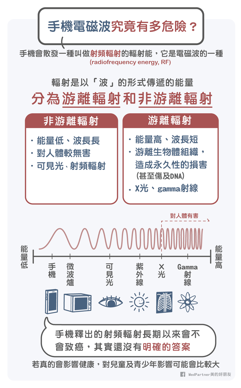 搭配淺顯易懂的圖片,讓人一眼就能搞懂各種輻射的差異,像下面那條從微波爐到 Gamma 射線的比較就很清楚,綜合來說目前還沒有明確指示手機的電磁波對人體的危害,如果真的有,也是對兒童和青少年比較有影響。