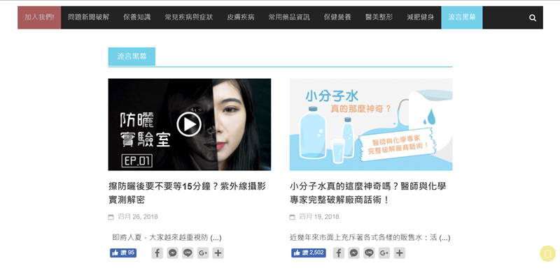 問題新聞及流言黑幕這兩區應該是大家最需要知道的,像是「擦防曬要不要等 15 分鐘」是很多女孩子的疑問,這裡就用影片清楚比較及解析,還有關於小分子水的廠商話術等等,都有專家來為你破解,知道真相之後別忘了告訴其他人,讓謠言止於智者。
