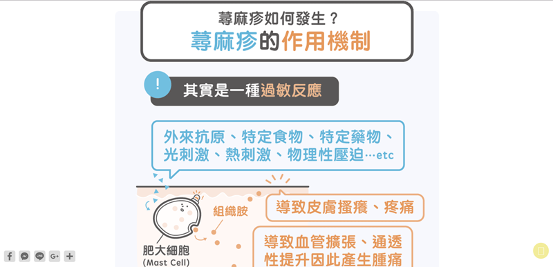 解說圖都蠻可愛的,之前有朋友的小孩得了蕁麻疹去看醫生也不解釋清楚,傳這張圖片過去應該就很好懂了,雖然說看網站長知識但真的生病還是要去看醫生才行哦。