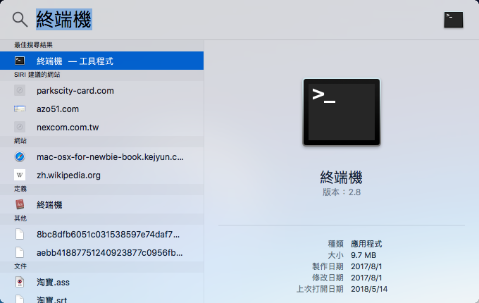 我們必須使用終端機(terminal)來處理,按右上角放大鏡搜尋。