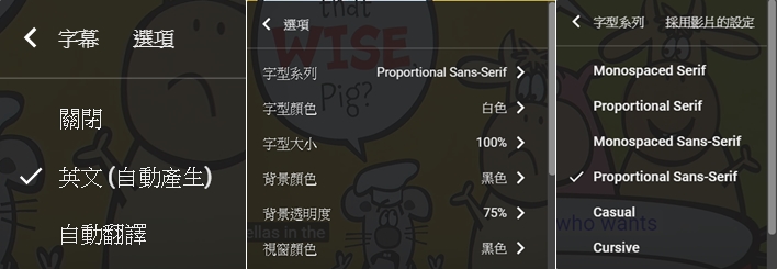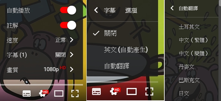 預設是沒有字幕的,可依需求開啟英文或自動翻譯成其他語言,除了中文繁簡體還有土耳其文、丹麥文、巴斯克文、日文,但因為是自動翻譯的文法會怪怪的。