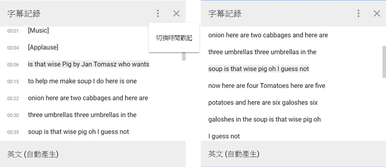 點開影片右下角清單可以開啟字幕紀錄,時間戳記也能隱藏,雖然沒有