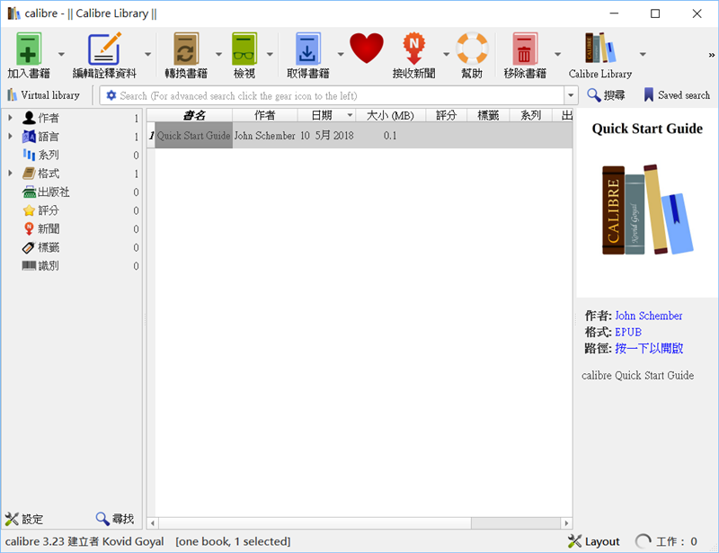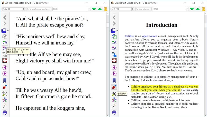 選擇正體中文之後下載,開啟後內建就有一份 EPUB 文件是使用說明,上排是功能列,左邊是檢視區,基本上比較偏轉檔與管理,跟編輯功能強大的 Flip PDF 不太一樣。