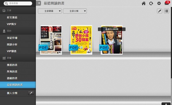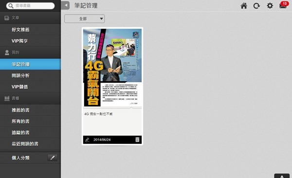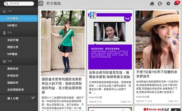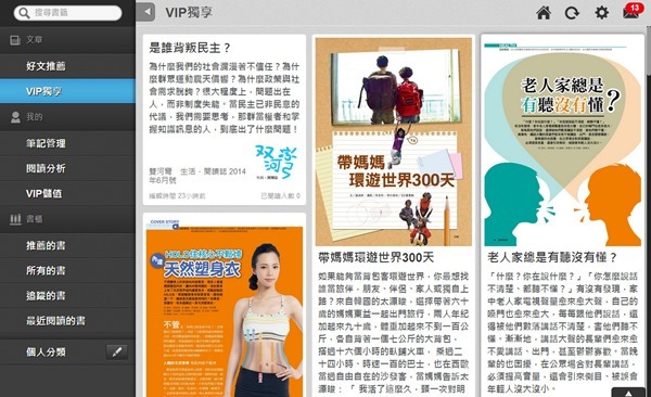 如果是從線上書櫃進入,首先都會進入 VIP 獨享,這裡面是由 Kollect 的編輯每日精選當月精彩的文章,每天只要花個幾分鐘就可以閱讀當月最新資訊,而且你也可以先下載再閱讀,或是邊讀邊下載,照你自己的閱讀習慣選擇,相當方便。