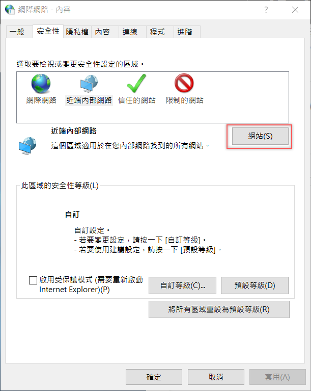 接著就來輸入設備的 IP 位址或 DNS 名稱,有點類似白名單的概念,這區的所有網站都會套用到區域的安全性設定。
