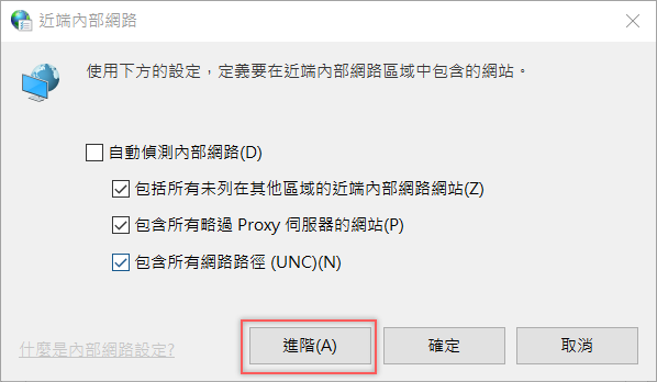 這裡就是關於內部網路的幾個設定,包括自動偵測以及網路的包含內容,我們要來進階設定。
