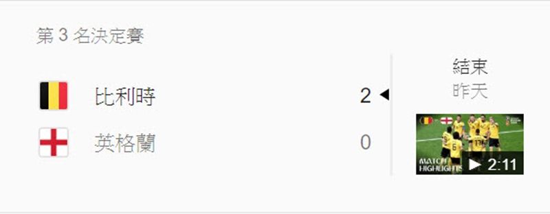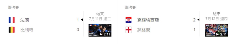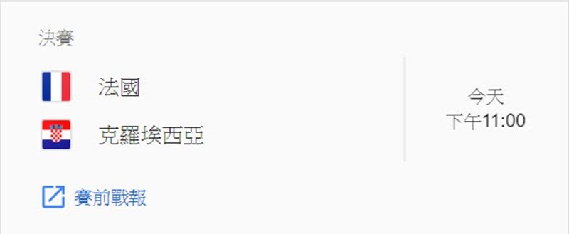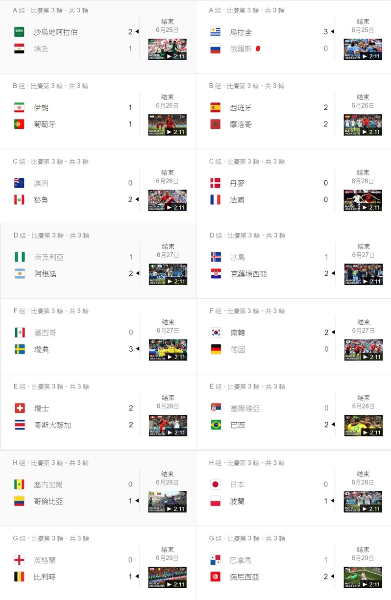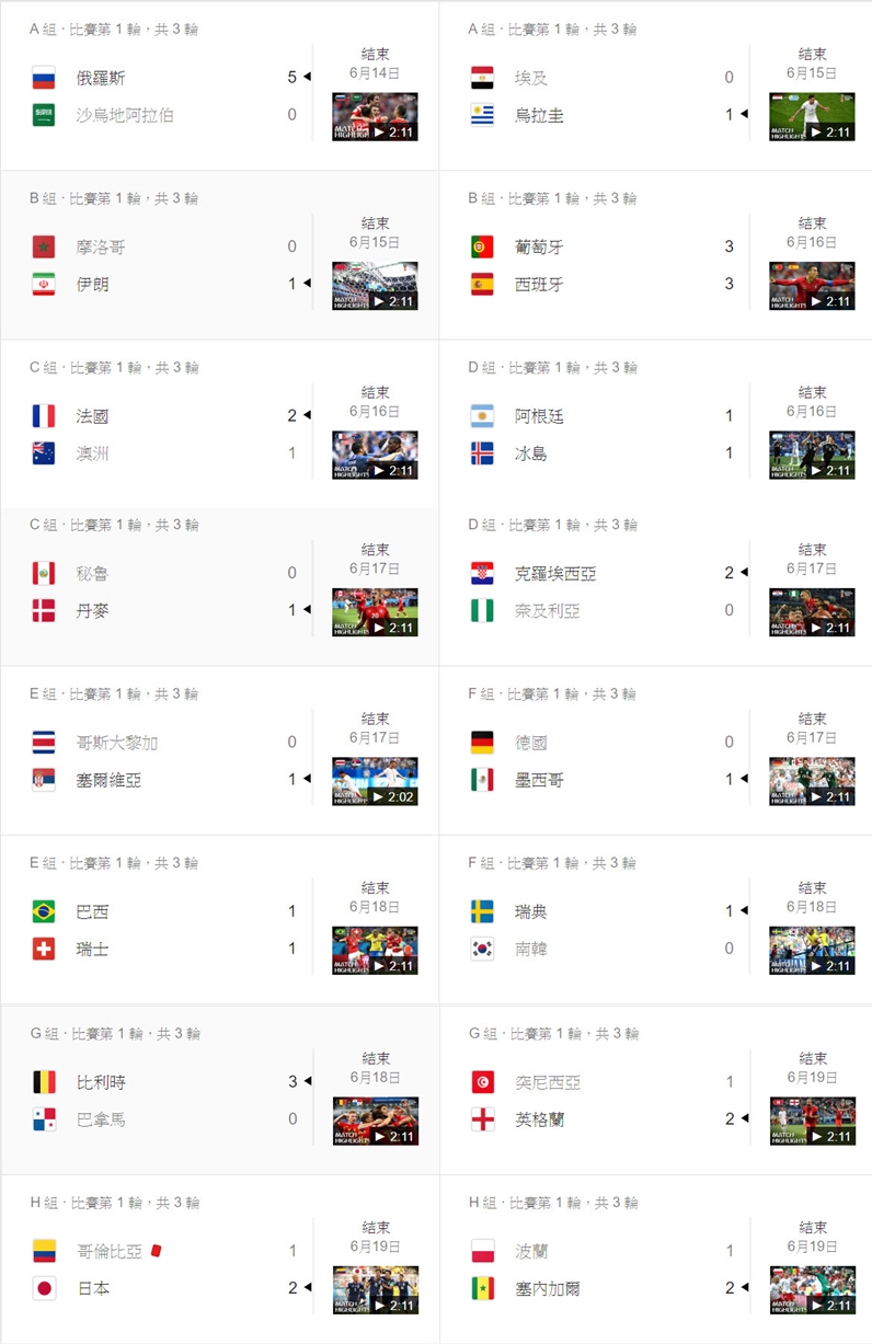 跟以往一樣,只要在 Google 搜尋「2018 世足賽」,就可以看到相關的賽程表,以及統計資料,並隨時更新結果。- 小組賽第一輪