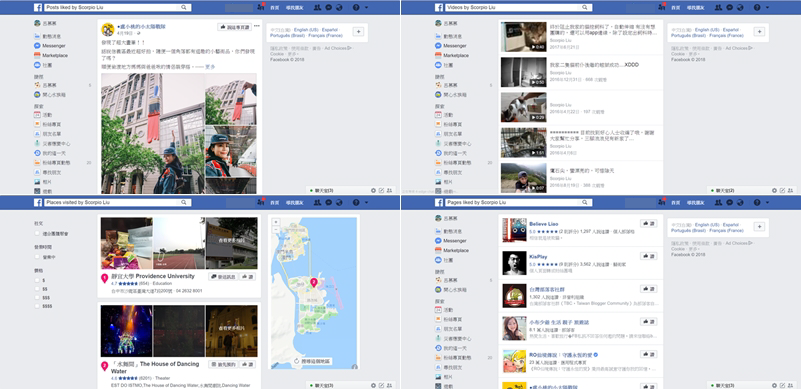 像這個帳號跟我不是朋友,但他的訊息幾乎都是公開的,所以我可以看到他按讚的文章、發布的影片、打卡的地點、喜歡的粉專,這些你也可以使用「篩選」或其他功能一個個查看,只是會花比較多時間,如果你覺得很恐怖,那就將觀看權限幾乎都設朋友甚至本人,不然在 FB 上都可以看光光的,只要有時間、有心。