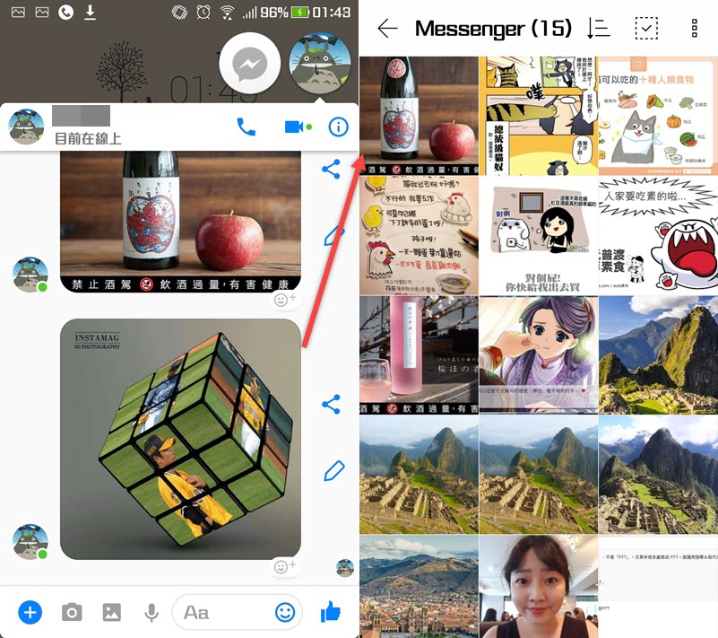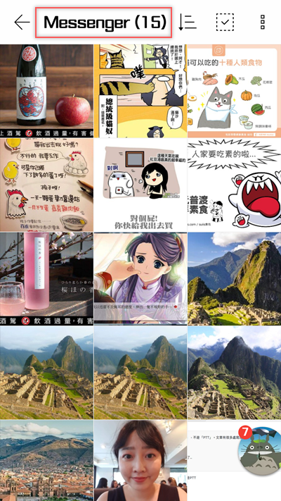 像下圖一樣,手機相簿自動開設的 Messenger 分類,會幫你儲存所有傳過來的照片,阿湯還算好的只有 15 張,看過有人的相簿充滿了長輩圖,刪都刪不完。