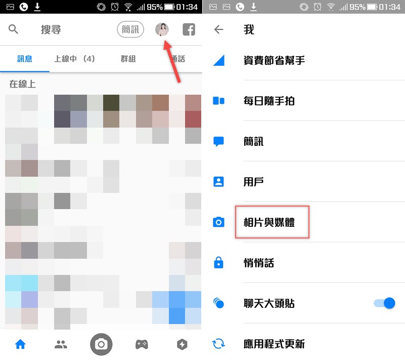 開啟手機裡的 Messenger APP,點左上角你的照片的那個小圖示,進入設定,往下滑找到「相片與媒體」。