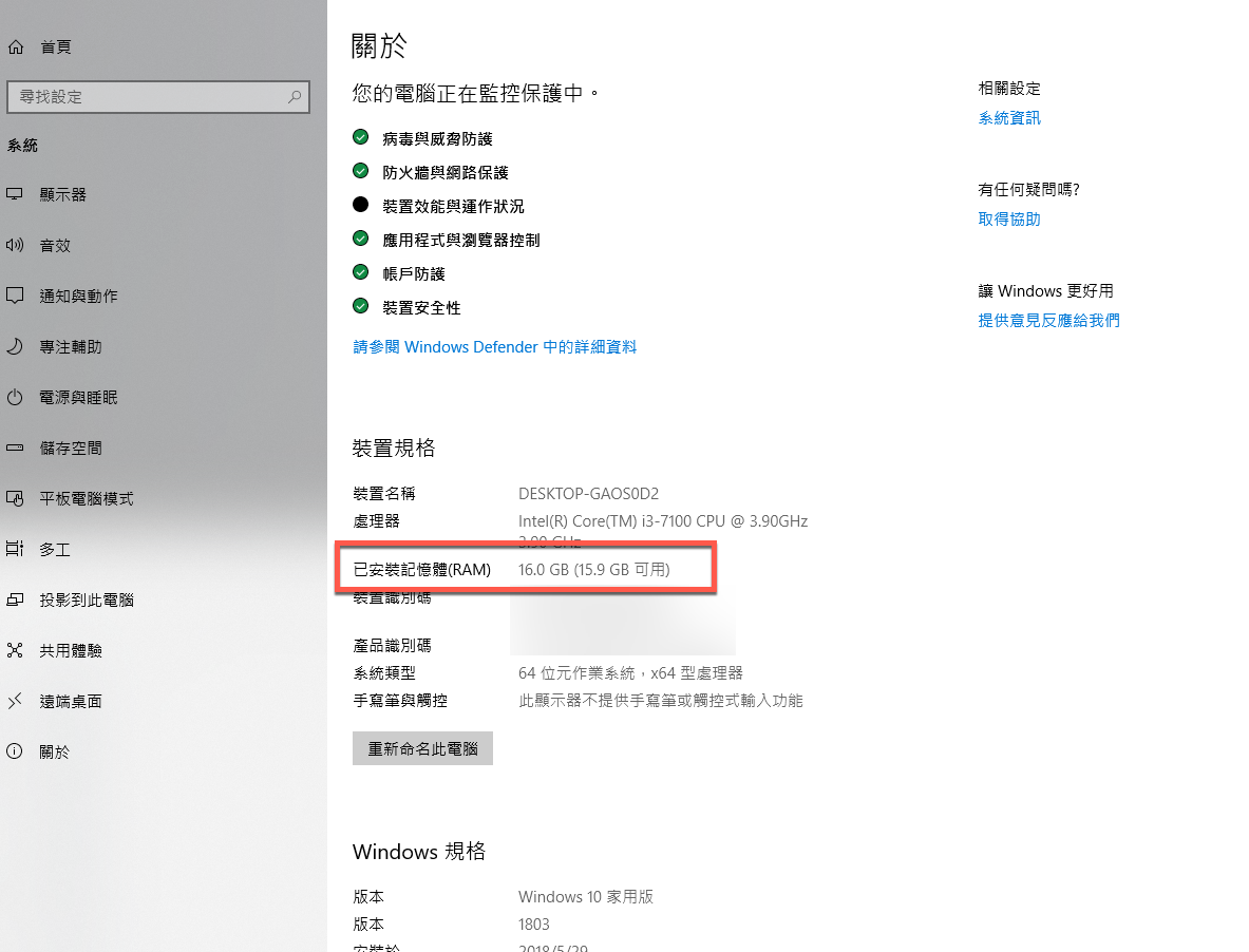 Windows 10 作業系統雖然更新的問題有點擾人,但安裝速度真的蠻快的,重灌不用像以前時間花的那麼長,重灌前其實阿湯已經在 BIOS 裡確認過記憶體容量以及 SSD 容量都沒有問題,不過重灌完還是要再看一下資訊來確認,是 16GB 無誤啊。