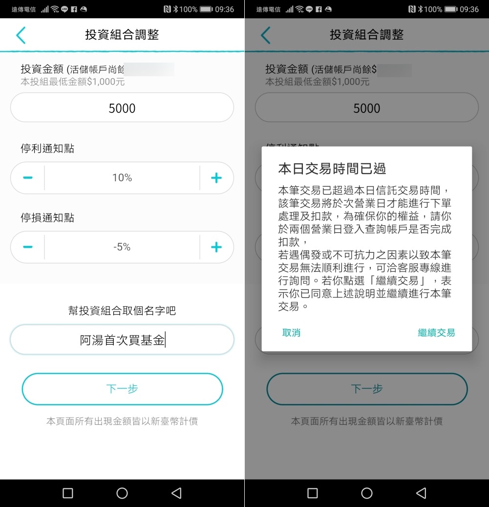 阿湯會想透過 Richart 購買基金看看的最大理由其實是可以設好停利跟停損通知,而且透過 APP 可以快速操作很便利,由於不只可以買一次,你也可以再試著買其他組合,所以記得可以幫每次投資組合取個自己看的懂的名字來區分投資項目。