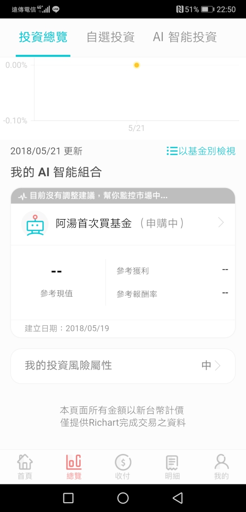 台新 Richart APP 前陣子在投資這一區塊中再推出了一個叫做「AI 智能投資」的新功能,稍稍研究了一下,這和先前推出的自選投資組合是不同的,主要透過主要透過人工智慧預測市場及你的理財風格來推薦適合你的投資組合,不需要自己花大把時間研究,阿湯人生中的首次基金購買就獻給了 Richart 了。