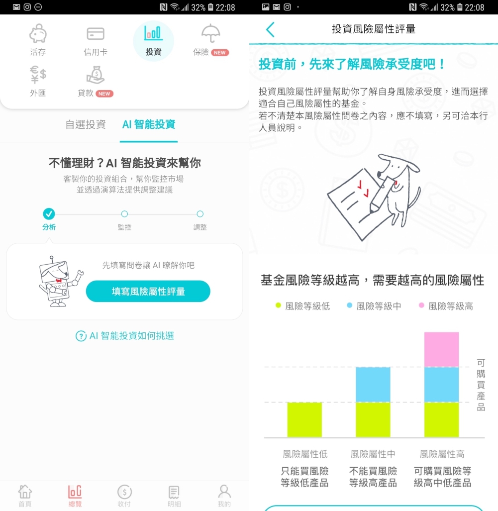 在開始前也會先讓你填寫問卷來評估你的投資風險屬性,然後會配出適合你屬性的投資組合給你。