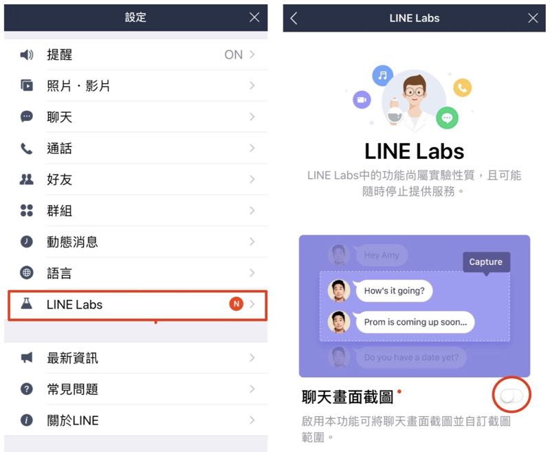 LINE 為 iOS 用戶推出了 8.7.0 更新,新加入了能讓用戶搶先體驗還在規劃階段,尚未確認推出的新功能的「LINE Labs」,並且帶來第一彈測試新功能 - 「聊天畫面截圖」。 「LINE Labs」,顧名思義就是 LINE 在孕育新功能的實驗室,目前只有限定在 iOS 上推出,也因為 LINE Labs 中的新功能,都是還沒有正式推出的新功能,因此 LINE Labs 會預設關閉,想體驗的朋友需要自行點選啟用。